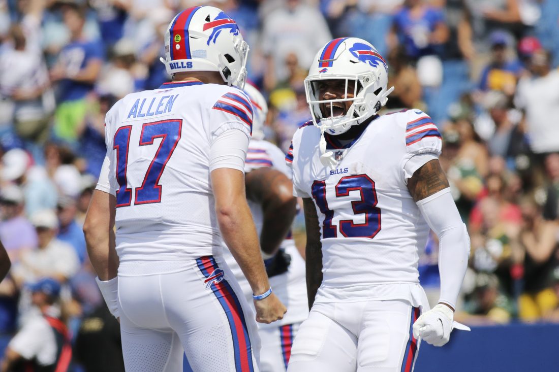 - Buffalo Bills wide receiver Gabriel Davis (13) celebrates with quarterback Josh Allen (17) after his touchdown during the first half of a preseason game against the Green Bay Packers, last Saturday, in Orchard Park. AP photo
