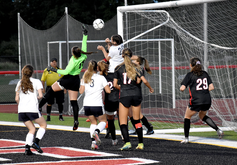 - A corner kick from Frewsburg’s Alexandra Hultberg eludes Clarence keeper Emily McLouth and a host of defenders during the second half of Thursday’s nonleague game in Clarence. P-J photo by Matt Spielman