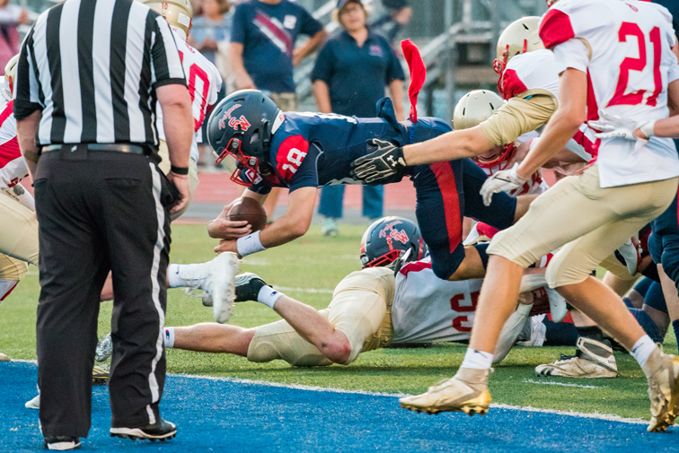 - Southwestern quarterback Aidan Kennedy dives towards the end zone for a touchdown in the second quarter of the Trojans’ 48-14 victory over Olean on Friday night. P-J photo by Valory S. Isaacson