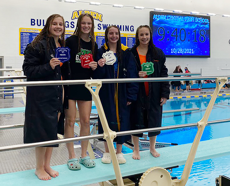 Elizabeth Pucci-Schaefer of Fredonia, left, Elayna Pitts of Frewsburg, second from right and Leah Marsh of Fredonia, right, finished first, third and fourth respectively at the Section VI Class C Diving Championships on Thursday at Alden Central School.