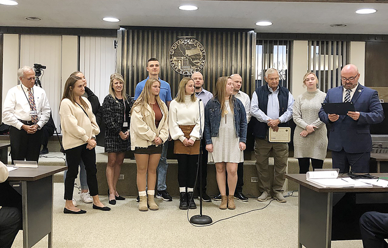 Chautauqua County Executive PJ Wendel, far right, reads a commendation during the county legislature meeting Wednesday. Both the Jamestown Community College men’s and women’s swim teams were issued separate commendations in recognition of their outstanding accomplishments. Wendel noted how the men’s swim team was named the National Junior College Athletic Association ’20-21 Academic Team of the Year. They achieved a team GPA of 3.18, earning top excellence among 820 other teams nationwide. The women’s swim team, Wendel shared, was the 2021 National Champion Swim Team for the Non-Scholarship Division and finished fourth place overall at the National Junior College Athletic Association Swimming and Diving Championships. Wendel also issued a commendation to Jamestown CC swim team member Karianne Yuchnitz for her performance at the championship where she was the women’s non-scholarship Swimmer of the Meet, earned seven All-American honors, and claimed the national championship in the 50-yard freestyle.