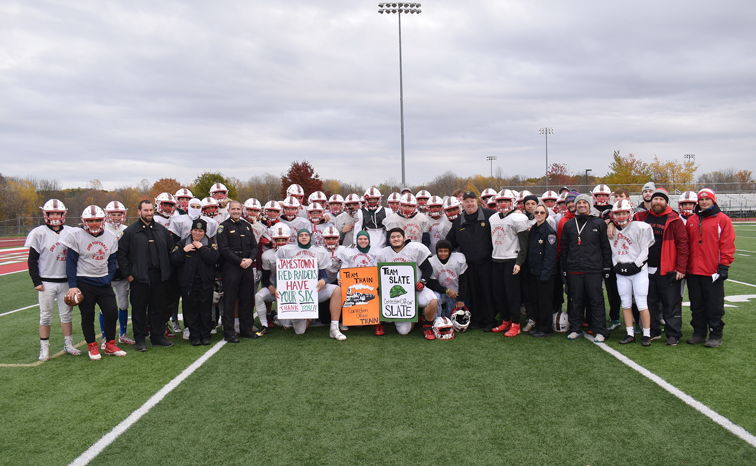 The men and women in blue had company in the form of the Jamestown High School varsity football team and its coaching staff. But the photo opportunity had nothing to do with the Red Raiders’ Section VI Class A semifinal against Williamsville South later this week. Rather, it was all about supporting Dunkirk resident Thomas Slate, who was diagnosed with amyloidosis in September. A 15-year veteran of the Sheriff’s Department, he also served in the U.S. Army for 25 years, including during Desert Storm.
