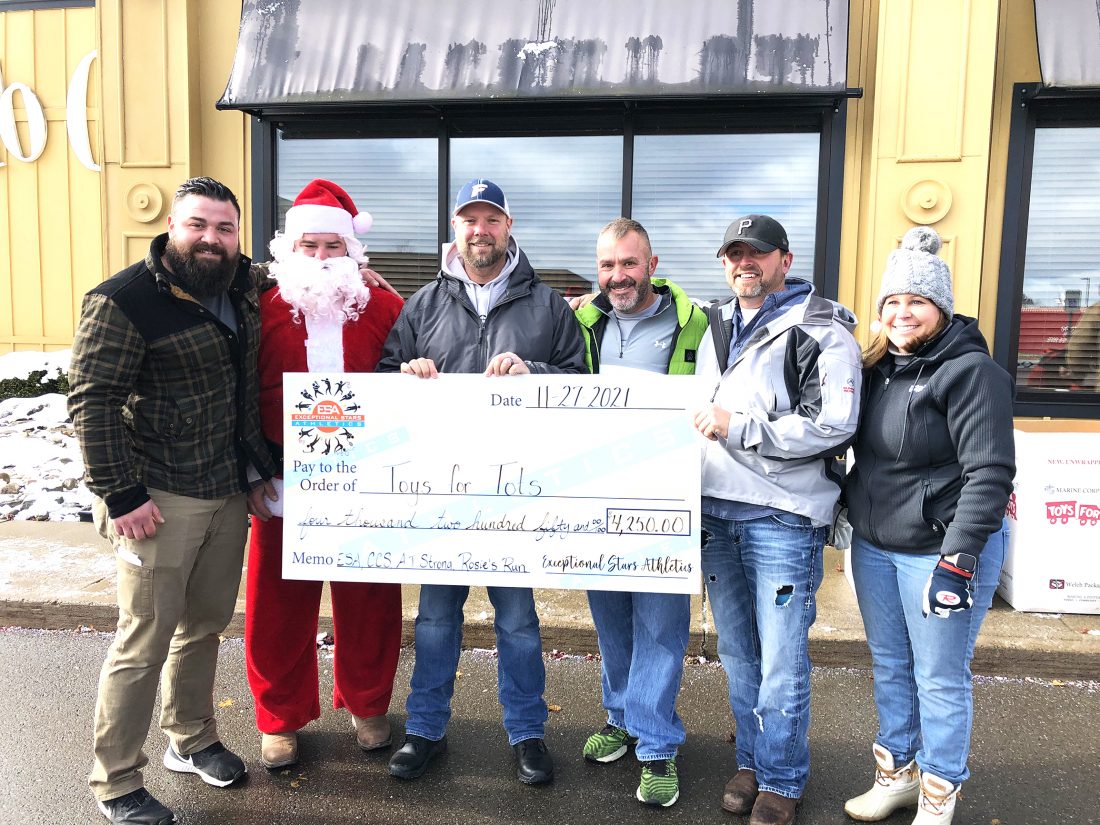Pictured are Nick Kahanic and Aaron Lee (Santa) from AJ Strong, Rich Bianco from Exceptional Stars Athletics, Patrick Smeraldo from Collaborative Children’s Solutions, Jamie Billquist from Rosie’s Run, and Terri Johnson from Toys for Tots. Submitted photo