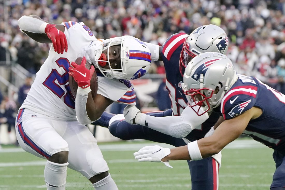 - Buffalo running back Devin Singletary, left, tries to break free from New England Patriots free safety Devin McCourty, rear center, and cornerback Myles Bryant, right, during the second half of Sunday’s game. AP photo