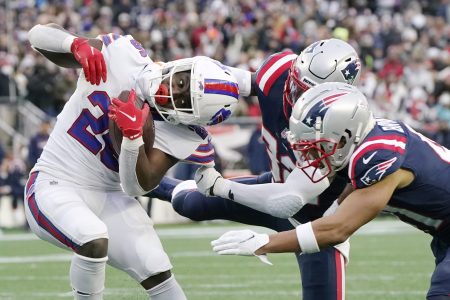 Buffalo running back Devin Singletary, left, tries to break free from New England Patriots free safety Devin McCourty, rear center, and cornerback Myles Bryant, right, during the second half of Sunday’s game. AP photo