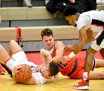 - Southwestern’s Griffin Bogdanowicz (12) attempts to grab a loose ball on the floor with Jamestown’s Trey Drake while the Red Raiders’ Sean Paige looks on during Friday’s first-round game at the United Way Tip-Off Tournament at McElrath Gymnasium. P-J photo by Scott Reagle