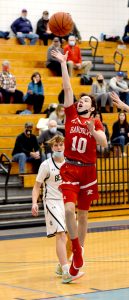 - Randolph’s Griffin Nelson (10) puts up a shot in the lane in front of Frewsburg’s Zack Carr during Monday’s CCAA Central Division game in Frewsburg. P-J photo by Matt Spielman