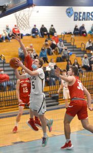 - Frewsburg’s Zack Carr (5) looks to score inside while being defended by Randolph’s Drew Hind and Jaiden Huntington (30) during Monday’s CCAA Central Division game in Frewsburg. P-J photo by Matt Spielman