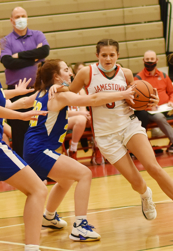 - Jamestown’s Marley Drake drives past West Seneca West’s Grace Vanderlip during Thursday’s ECIC Division 1 basketball game at McElrath Gymnasium. P-J photo by Scott Kindberg