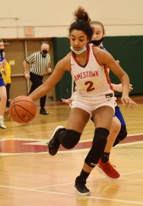 - Jamestown’s Mickia Freeney dribbles up the court during Thursday’s game. P-J photo by Scott Kindberg
