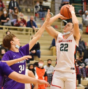 - Jamestown’s Jaylen Butera shoots a jumper over a Hamburg defender during Monday’s ECIC Division 1 boys basketball game at McElrath Gymnasium. P-J photo by Scott Kindberg