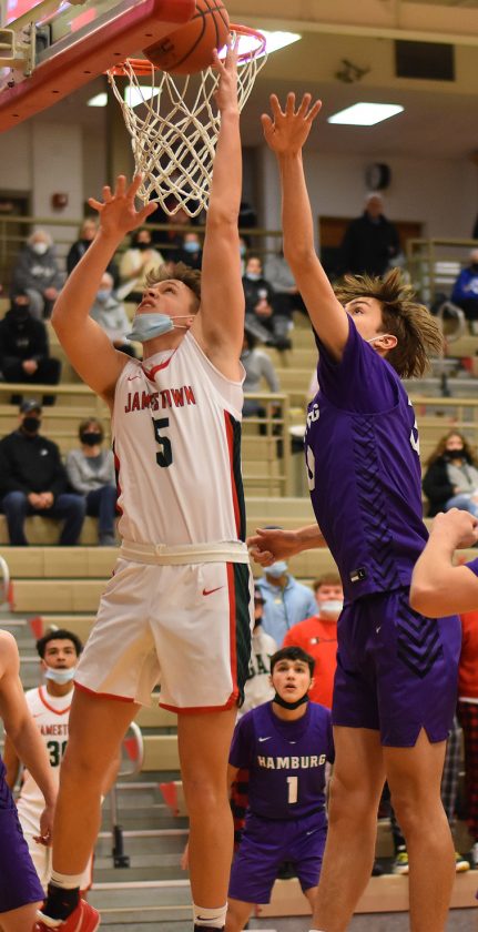 - Jamestown’s Trey Drake (5) scores on a reverse layup in front of a Hamburg defender during Monday’s ECIC Division 1 boys basketball game at McElrath Gymnasium. P-J photo by Scott Kindberg