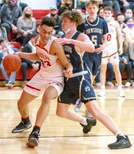 Randolph’s Gabe McCoy protects the ball from Frewsburg’s Zach Winters during Tuesday’s CCAA Central Division basketball game at Randolph High School. Photo by Mike Frame