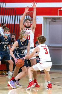 Frewsburg’s Gavin Smith protects the ball from Randolph’s Jaiden Huntington, left, and Drew Hind during Tuesday’s game in Randolph. Photo by Mike Frame