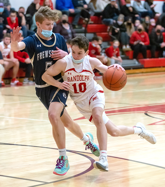 - Randolph’s Griffin Nelson (10) attempts to drive by Frewsburg’s Zack Carr during Tuesday’s CCAA Central Division game in Randolph. Photo by Mike Frame