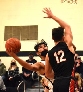 Maple Grove’s Tucker Fenton closely guards Silver Creek’s Ray Cortes during Wednesday’s Section VI Class C playoff basketball game. P-J photo by Christian Storms