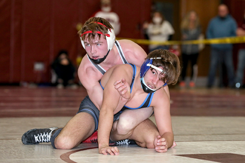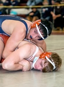 - Southwestern’s Tavio Hoose works on top of Randolph’s Luke Pagett during the 172-pound final Saturday at Eden High School. Photo courtesy of Michelle Gilbert | Charming Artistry
