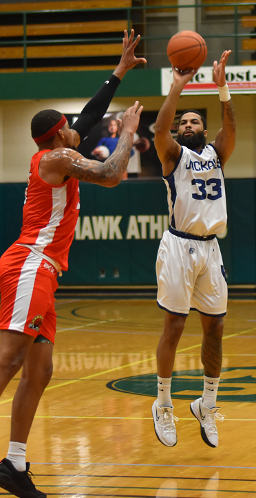 In this file photo from last month, Thomas Garrick of the Jamestown Jackals puts up a 3-pointer during The Basketball League game at Jamestown Community College. Garrick won the 3-point shooting contest Friday night at the TBL All-Star Weekend in Syracuse.