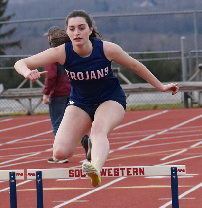 - Southwestern’s Gabby Wigren competes in the hurdles during Tuesday’s CCAA track and field meet against Dunkirk at Southwestern Central School. P-J photo by Scott Kindberg