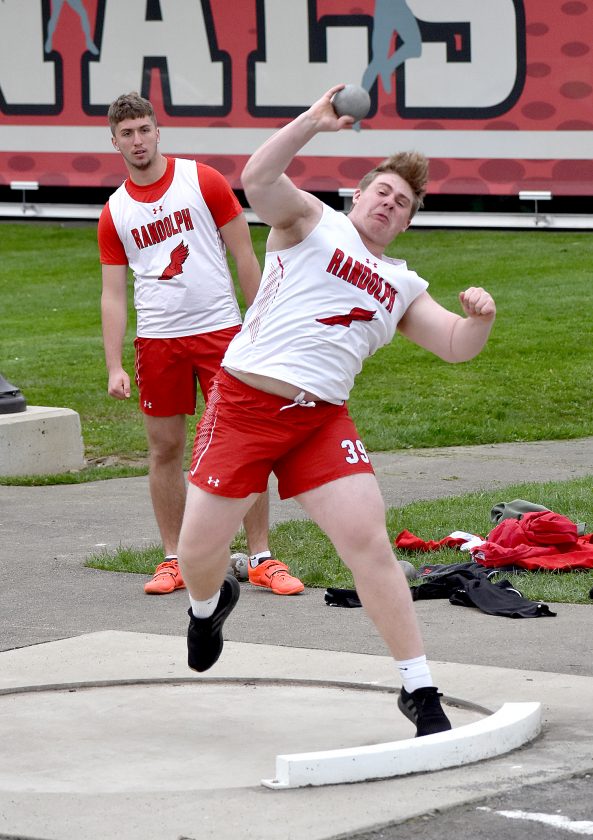 - Randolph’s Ryan Carpenter competes in the shot put Tuesday in Randolph. P-J photo by Matt Spielman