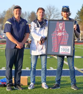 To cap the awards ceremony, Bucknell University sophomore and 2020 Cassadaga Valley Central School graduate Rayven Sample, presented Falconer/Cassadaga Valley coaches Dave Nelson and Nick Spry with his uniform top and number from the 2021 Paralympic Games in Tokyo. Sample was a member of the United States team and competed in the 400 meters after winning the T45 classification trials last June.