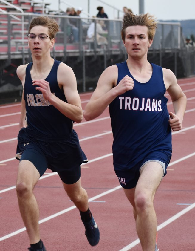 - Falconer/Cassadaga Valley’s Alex Reynolds and Southwestern’s Trenton Shutters run side by side in the 800 meters. P-J photo by Scott Kindberg