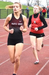 - Maple Grove’s Abby Brunenavs stays ahead of Randolph’s Sydney Smith in the 800 meters. P-J photo by Christian Storms