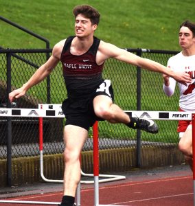 - Maple Grove’s Sam Eimiller clears a hurdle in the 110-meter hurdles on Tuesday at Maple Grove. P-J photo by Christian Storms
