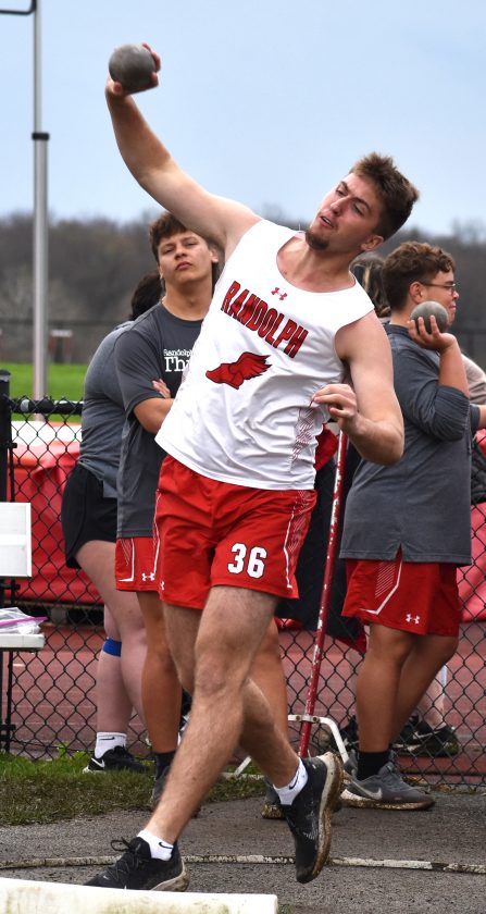 - Randolph’s Jaiden Huntington throws the shot put on Tuesday at Maple Grove. P-J photo by Christian Storms