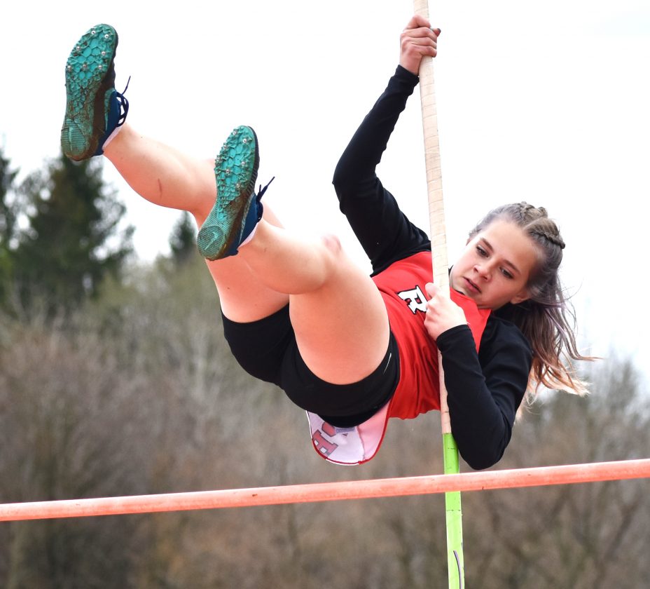 - Randolph’s Willow Rader clears the bar in the pole vault on Tuesday at Maple Grove. P-J photo by Christian Storms