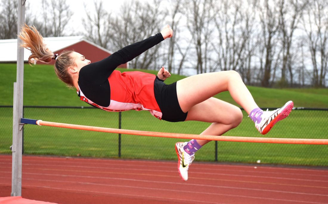 - Randolph’s Lucy VanRensselaer clears the bar in the high jump on Tuesday at Maple Grove. P-J photo by Christian Storms