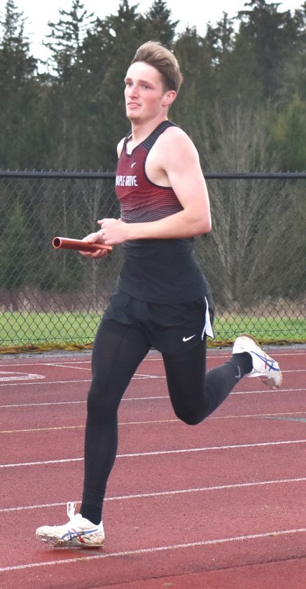 - Maple Grove’s RJ Helt runs the final leg of the 3,200-meter relay against Randolph on Tuesday at Maple Grove. P-J photo by Christian Storms