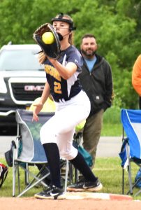 - Frewsburg first baseman Reagan Chitester steps on first for an out during Wednesday’s Section VI Class C prequarterfinal softball game against Silver Creek at Robert H. Jackson Elementary School Athletic Complex in Frewsburg. P-J photo by Christian Storms