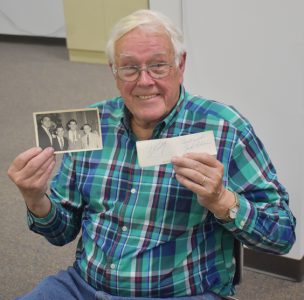 - Rich Fischer of Lakewood pays a visit to the Chautauqua Sports Hall of Fame in Jamestown to donate an autograph book filled with signatures from the 1950s when he, as a teenager, attended the Temple Hesed Abraham Men’s Club Sports Night at the Hotel Jamestown. P-J photo by Scott Kindberg