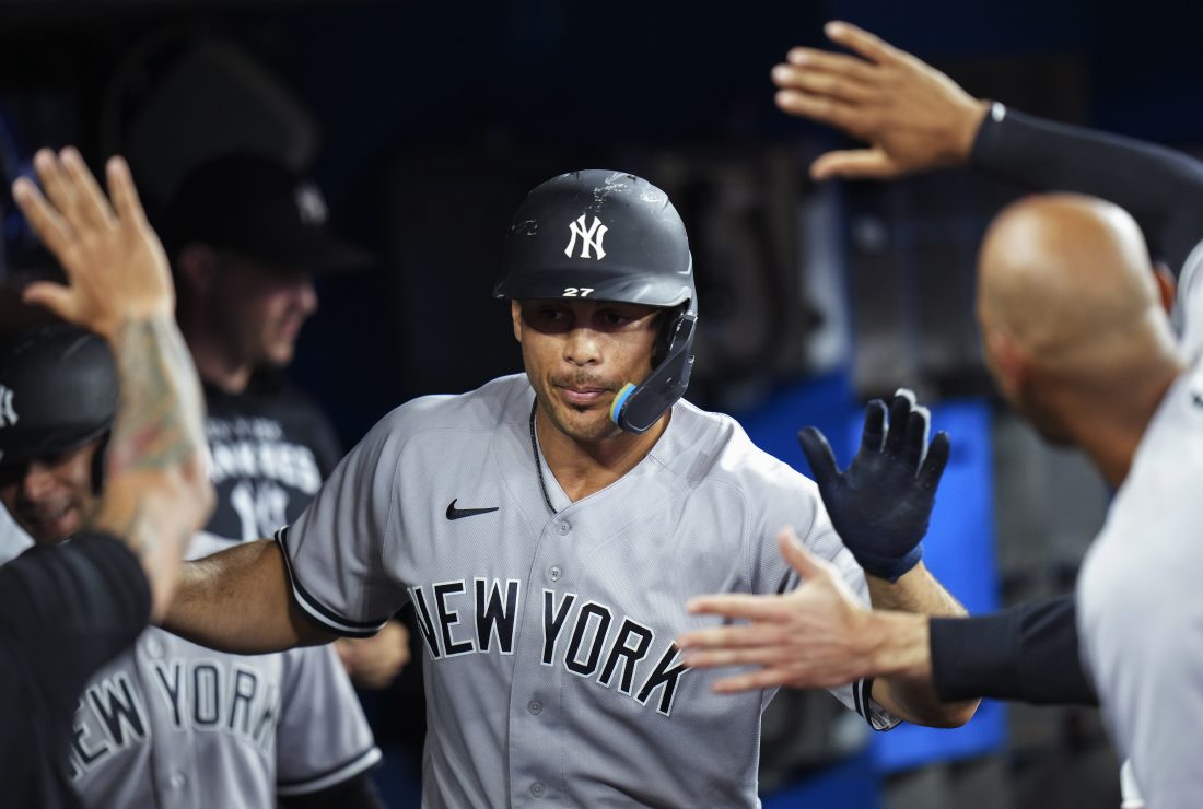 New York Yankees’ Giancarlo Stanton (27) is congratulated after scoring against the Toronto Blue Jays during the seventh inning of Tuesday’s game in Toronto. AP photo