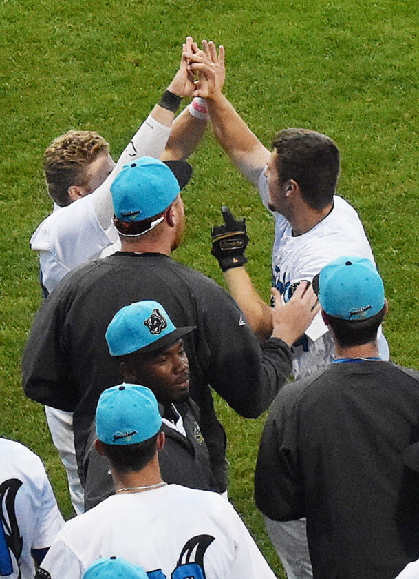 Jamestown’s Johnny Kampes, right, celebrates his three-run home run in Saturday night’s PGCBL game against Elmira. P-J photo by Scott Kindberg