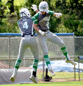 - Clymer/Sherman/Panama’s Bryce Hinsdale and Gabe Roth celebrate their Section VI Class D championship late last month at Diethrick Park in Jamestown. P-J file photo by Matt Spielman