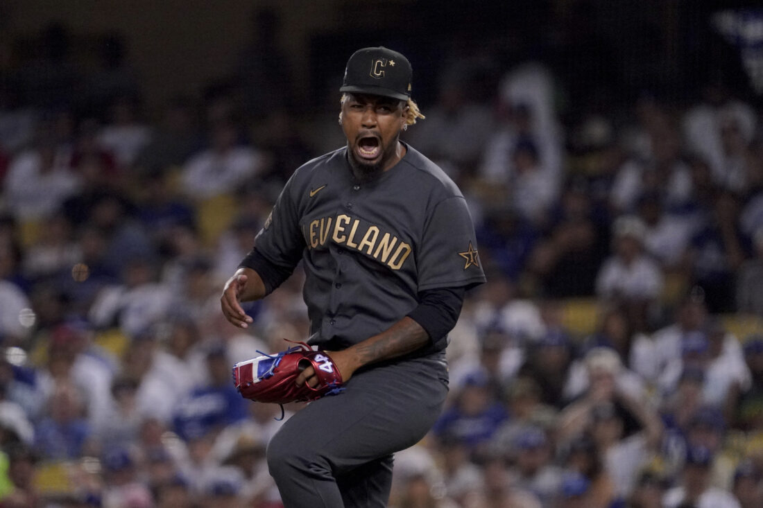 - American League pitcher Emmanuel Clase of the Cleveland Guardians reacts after striking out the National League’s Jake Cronenworth of the San Diego Padres for the final out of Tuesday’s MLB All-Star game in Los Angeles. AP photo