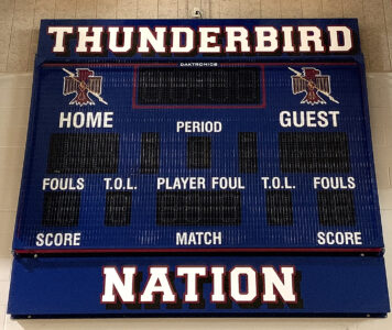 - Pictured is one of two new scoreboards installed in the main gym. P-J photo by Matt Spielman
