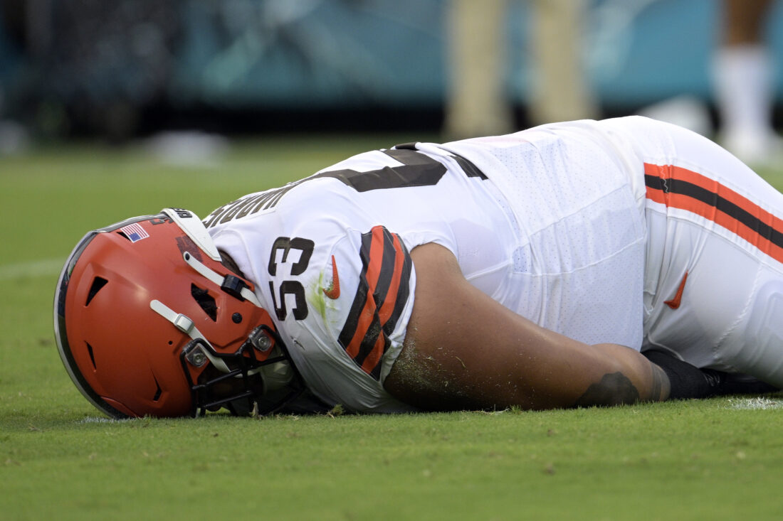 Cleveland Browns center Nick Harris (53) lays on the turf after he was injured during the first half of a preseason football game on Friday, Aug. 12 in Jacksonville, Fla. AP photo