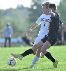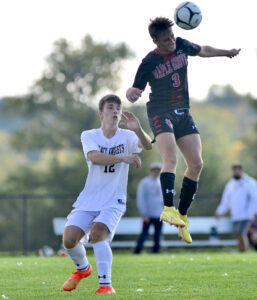 Maple Grove’s Eli Moore (3) rises up in front of Silver Creek/Forestville’s Shawn Kelly and heads the ball into the Black Knights’ goal for his 66th career goal to become the Red Dragons’ all-time leading goal scorer Monday. P-J photo by Scott Reagle