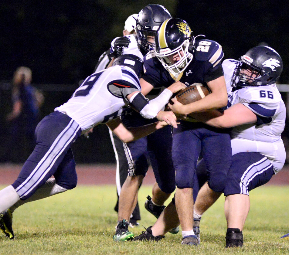 - Frewsburg’s Vincent Sanfillippo is pulled down by a host of Cattaraugus-Little Valley defenders during Friday’s Class D opener for both teams in Frewsburg. P-J photo by Scott Reagle