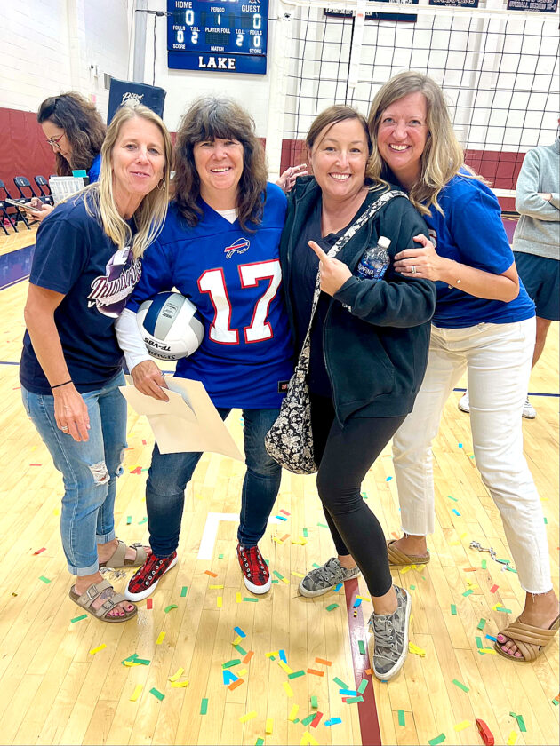 Chautauqua Lake celebrates head coach Joanne Meadows’ 500th career victory after the Thunderbirds defeated Panama 3-1 in CCAA Division 2 West volleyball action Thursday in Mayville. Photo by Deb Bailey