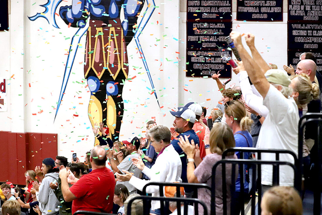 Fans celebrate after Chautauqua Lake beat Panama, giving Thunderbirds head coach Joanne Meadows her 500th career win. Photo by Deb Bailey