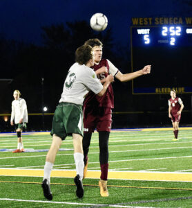 North Collins’ Montana Robbins, left, and Ellicottville’s Maddoxx Johnson go up to head a ball during the second half of Wednesday’s Section VI Class D semifinal at West Seneca West High School. P-J photo by Christian Storms