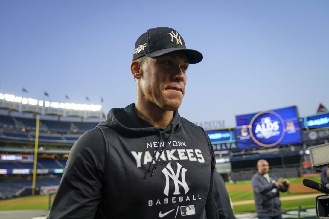 New York Yankees’ Aaron Judge walks toward the dugout after workouts ahead of Game 1 of baseball’s American League Division Series against the Cleveland Guardians on Monday in New York. AP photo