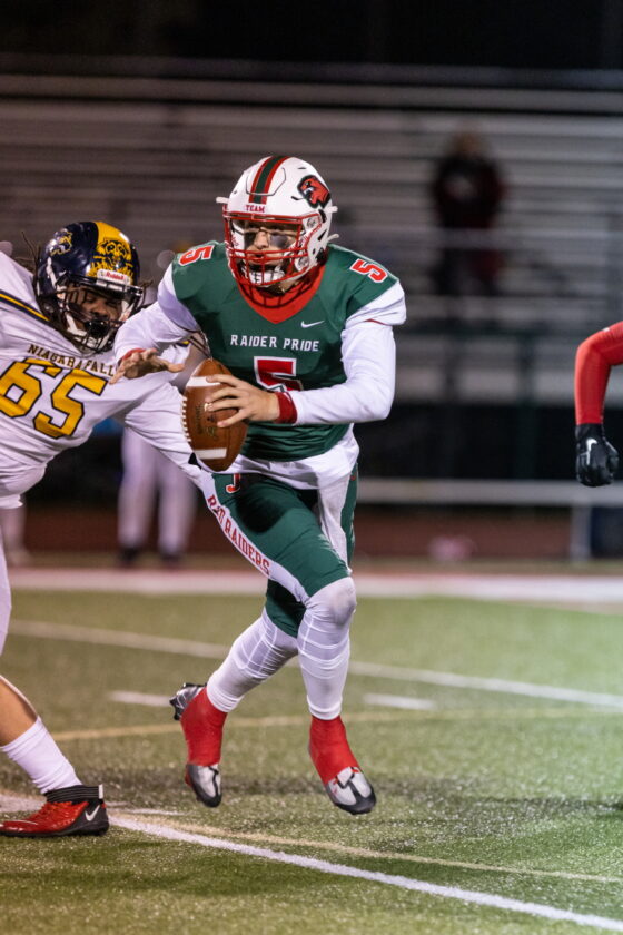 Red Raiders quarterback Trey Drake rolls out prior to throwing a pass to set the school’s career yardage record. P-J photo by Tim Frank