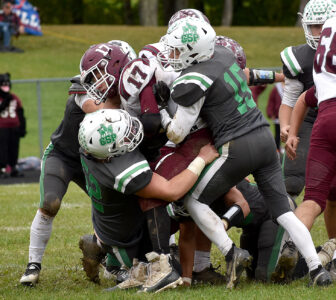 - Portville’s Zander Keim is tackled by Clymer/Sherman/Panama’s Trent Burchanowski (15) and Taite Newman (52) during Saturday’s Class D game at Jack Keeney Community Field in Panama. P-J photo by Matt Spielman