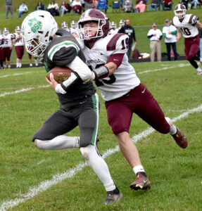 - Portville’s Kaedon Holcomb is tackled by Clymer/Sherman/Panama’s John Watson during Saturday’s Class D game at Jack Keeney Community Field in Panama. P-J photo by Matt Spielman