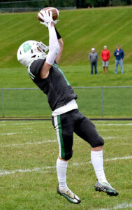 - Clymer/Sherman/Panama’s Bryce Hinsdale catches a pass early in Saturday’s Class D game against Portville at Jack Keeney Community Field in Panama. P-J photo by Matt Spielman